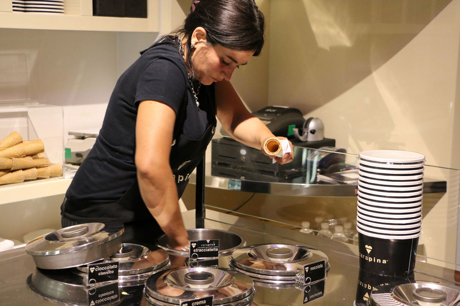 Il gelato al Carapina è fatto soltanto con ingredienti naturali e di alta qualità: frutta fresca e stagionale, latte intero fresco, cioccolato di qualità e caffè proveniente dall'America centrale. La bontà degli ingredienti traspare da ogni gelato che abbiamo preso al Capirina da quando ha aperto, non solo quindi, quello che abbiamo assaggiato questa estate. E' cremoso e leggero, i gusti alla frutta sono così saporiti che sembra di dare un morso al frutto stesso; non è esposto in vetrina, ma conservato in contenitori argentei sotto nel bancone, in modo da mantenere costante la temperatura a cui il gelato rimane soffice e cremoso: potete vedere quanto lo sia già quando lo mescolano per poi prenderlo e metterlo sul cono o riempirvi la coppetta. La quantità dei gusti è limitata, dato che si tratta di varietà stagionali, ma il gelato è fatto fresco ogni giorno e rifatto durante la giornata, se ve ne è bisogno, sul retro del negozio.