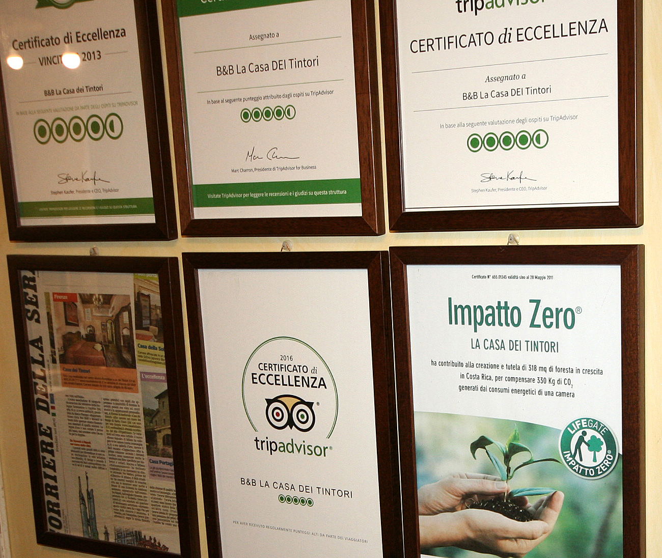 Un particolare speciale del B&B è la parete dei commenti, dove gli ospiti passati hanno lasciato il loro personale segno in modo che possa esser scoperto da quelli futuri, come testimonianza dell'impegno e della passione dei giovani proprietari nel loro lavoro, dei loro servizi impeccabili - un pò come i resti dell'antico sistema di drenaggio dei tintori che un tempo occupavano l'edificio. Ma non sono solo gli ospiti che hanno qualcosa da dire su La Casa dei Tintori: associazioni di fama internazionale hanno dato il loro speciale marchio di qualità ed eccellenza al B&B, soprattutto in merito all"impatto zero", risultato diretto della loro scelta di ristrutturare la casa utilizzando quanto più materiale originale possibile.