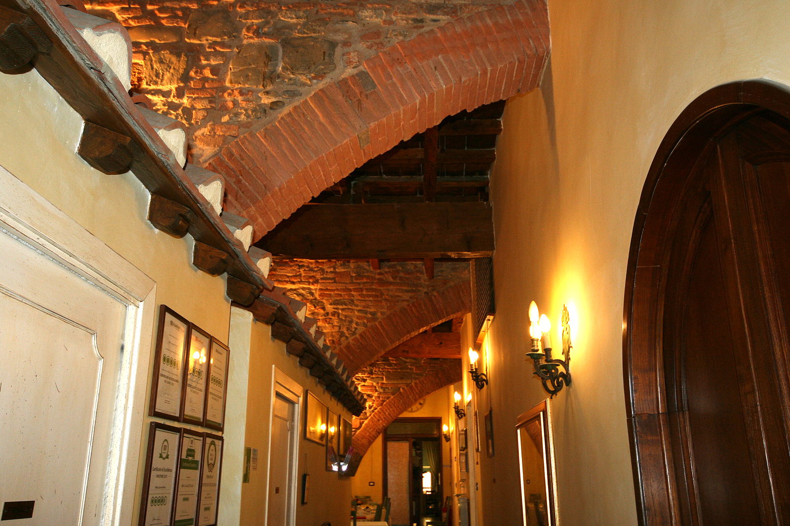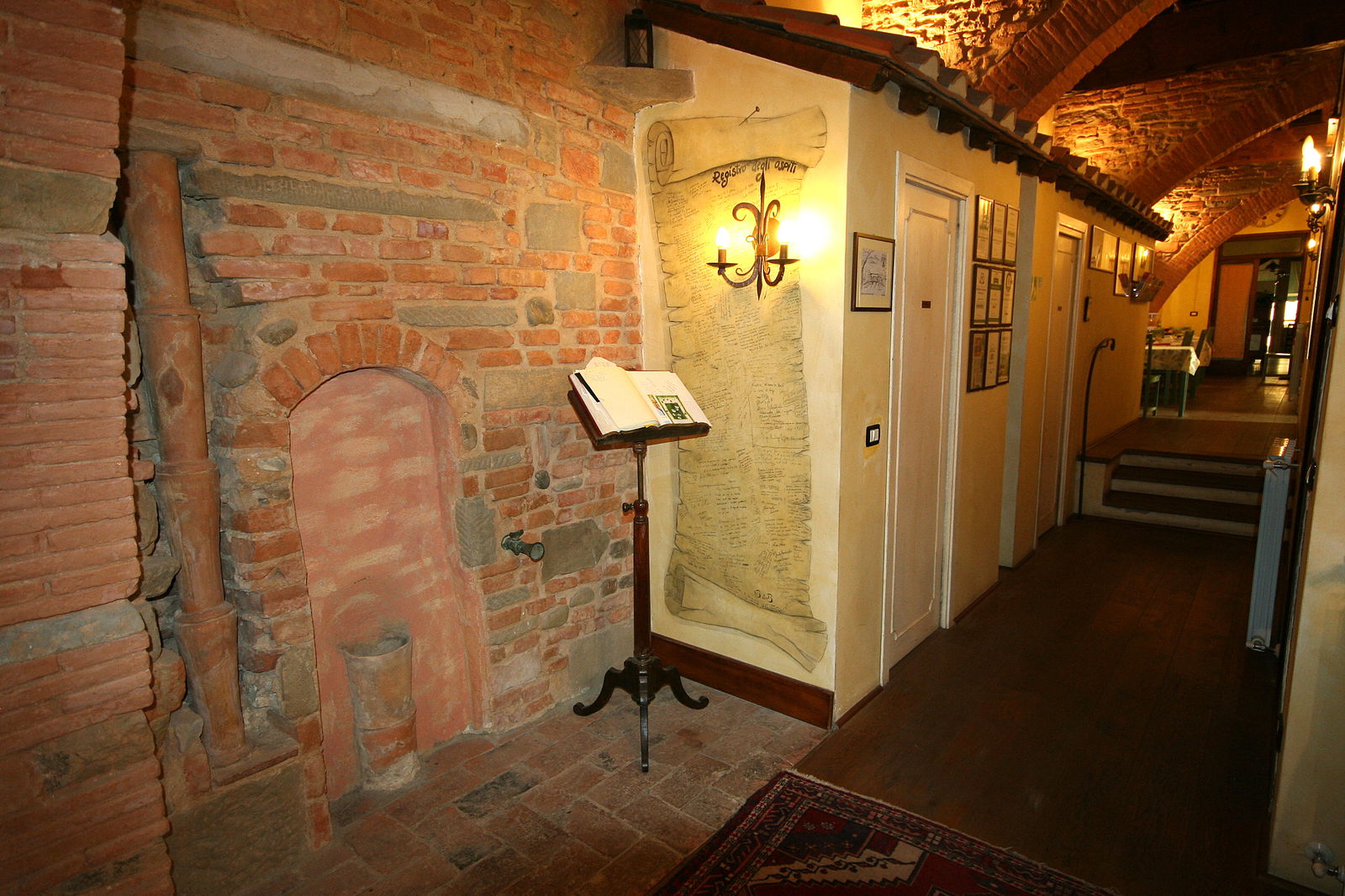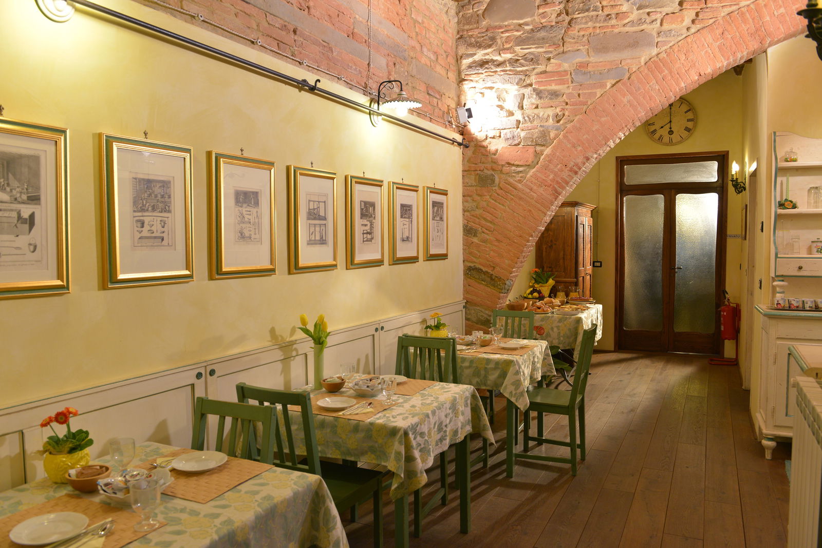 Usando delle mattonelle in terracotta, è riuscito a ricreare l'illusione di camminare in un viale o una stradina pur essendo al chiuso. Ho avuto l'impressione di essere stata catapultata in un set cinematografico del 1500...la zona adibita alla colazione, "incastonata" tra la reception e l'appartamento di famiglia, sembra essere un bar all'aperto dove un cappuccino è sempre pronto per ogni avventore.