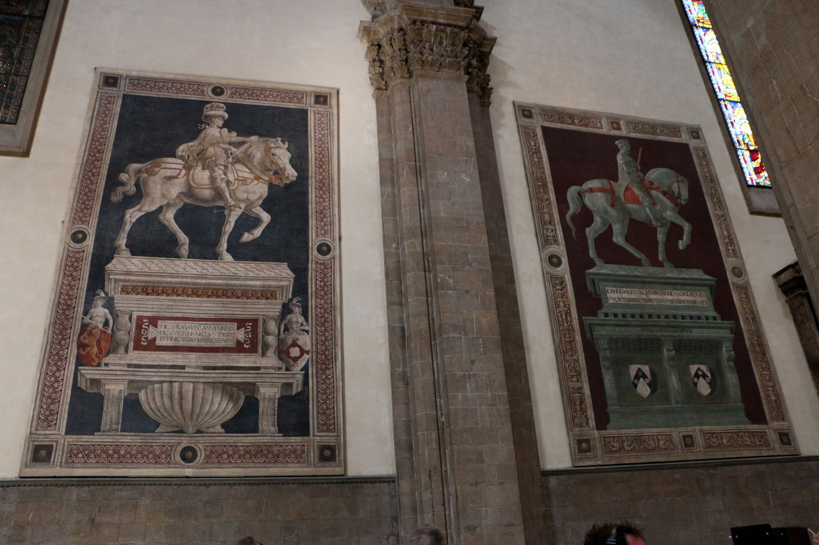 Ci sono da notare anche 3 affreschi che si trovano sul lato sinistro della navata: Dante davanti alla città di Firenze di Domenico di Michelino (1465) che è particolarmente interessante perchè ci mostra, a parte scene della Divina Commedia, una veduta di Firenze che nel 1465 non poteva essere la Firenze del tempo di Dante; il Monumento funerario a Sir John Hawkwood di Paolo Uccello (1436, quello a sinistra qui sotto) e la Statua Equestre di Niccolò da Tolentino di Andrea del Castagno (1456, quella a destra). Tutte e due affreschi mostrano i condottieri come figure eroiche che cavalcano triumfanti. Se notate, tutte e due artisti hanno avuto difficoltà nell'applicare e nuove regole della prospettiva: hanno usato due punti di unificazione invece di solo uno.