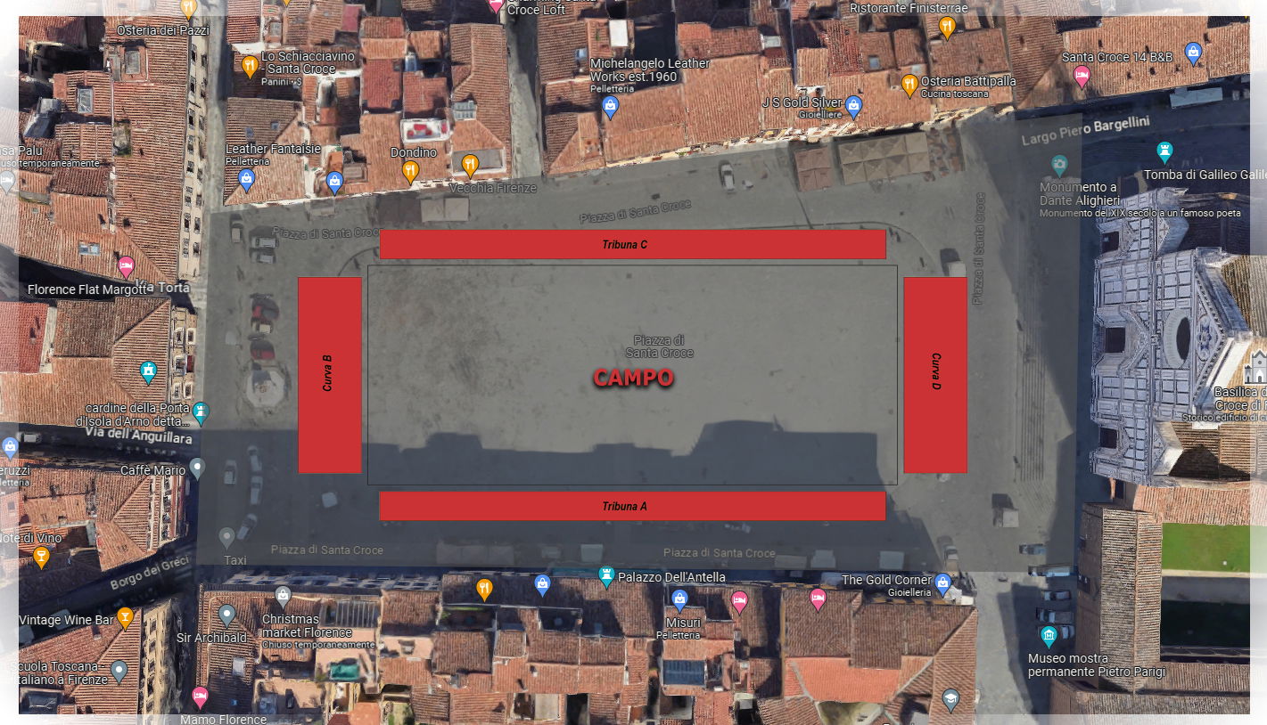 La Tribuna "A" sarà interamente dedicata ad ospitare i personaggi storici del Corteo della Repubblica Fiorentina. Non saranno quindi disponibili biglietti per la vendita al pubblico.