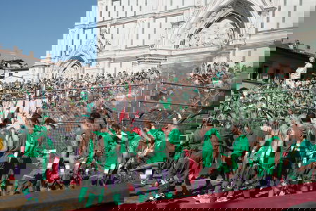 Le due semifinali vengono solitamente disputate in un solo weekend nella prima metà di giugno. Le squadre vincitrici giocheranno l'una contro l'altra nella finale, che viene sempre disputata il 24 giugno in grande stile, giorno in cui si festeggia anche il santo patrono della città, San Giovanni Battista. Una stupenda sfilata in costumi storici percorre le vie del centro partendo da Piazza Santa Maria Novella per arrivare in Piazza Santa Croce. Tutte e quattro le squadre sono presenti alla sfilata, anche quelle che non devono disputare la finale: riconoscerai i calcianti passare per andare a giocare la finale. Per le semifinali, la sfilata comincia indicativamente intorno alle 17 del pomeriggio, per giungere in piazza verso le 18 e le partite iniziano alle 19. Per la finale, il corteo parte verso le 15.45 da piazza Santa Maria Novella. L’arrivo in piazza Santa Croce è previsto alle 17, con l’esibizione sul sabbione degli sbandieratori e inizio della partita alle 18. Basta affacciarsi in centro per trovarsi catapultati in mezzo al divertimento del corteo storico!