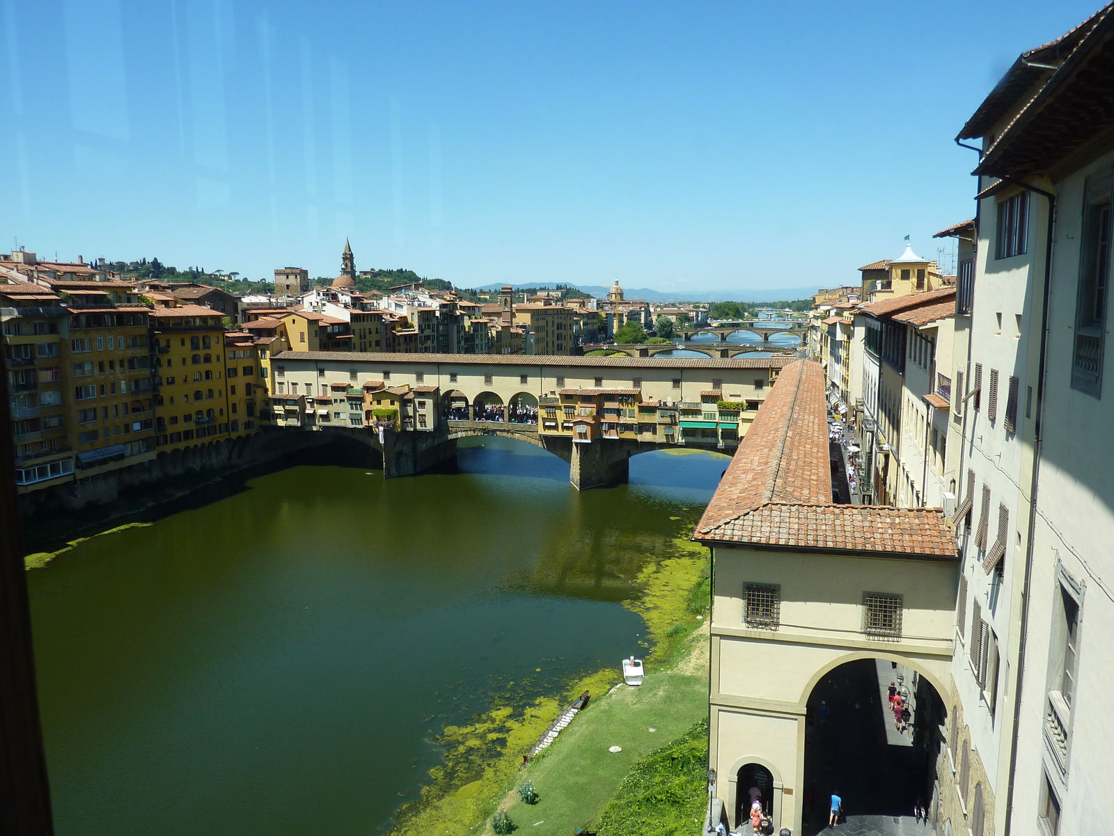 Dalle finestre del Corridoio si gode di scorci unici su Firenze e ci si rende subito conto di quanto fosse un passaggio privilegiato, che permetteva di vedere in strada, senza essere visti. A parte questa vista straordinaria, il Corridoio è arricchito con ritratti del XVII secolo e XVIII e conserva una collezione davvero straordinaria di autoritratti praticamente fino al XX secolo.