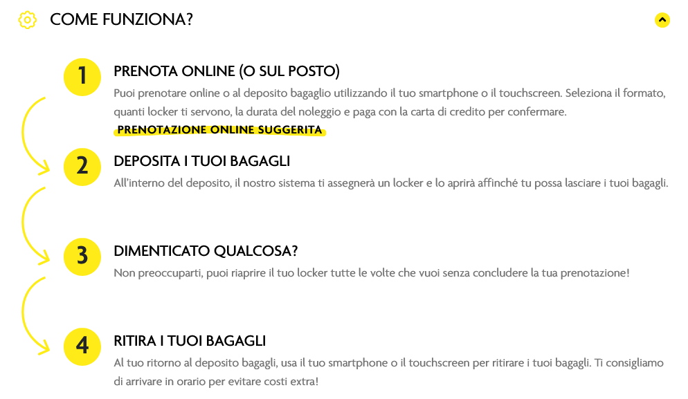 ci sono tre tipi di armadietti che ti permettono si lasciare da 1 (small) a 2 trolley piccoli (standard) per un intera giornata e fino a 4 trolley piccoli (maxi) (assicurazione per bagaglio incluso nel prezzo)
