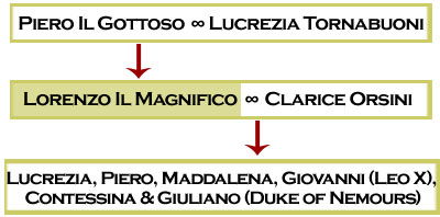L'erede di Lorenzo, ovvero il figlio più grande, Piero, detto "lo Sfortunato o il Fatuo", sperperò il restante patrimonio della famiglia e causò il crollo della casata medicea nel 1494. Fortunatamente, il secondo figlio di Lorenzo, Giovanni, divenne nel frattempo Papa Leone X e dette nuova vita a Firenze meno di 20 anni dopo. Nel 1537, quando il primo duca di Firenze, Alessandro de' Medici (un cugino) fu assassinato, il ramo "più vecchio" della famiglia si estinse ed il potere passò nelle mani di quello "più giovane", ovvero di quei membri che discendevano da Lorenzo Il Vecchio (fratello di Cosimo II), dando vita al regno di Cosimo I, conosciuto anche come Cosimo il Grande e Granduca di Toscana.