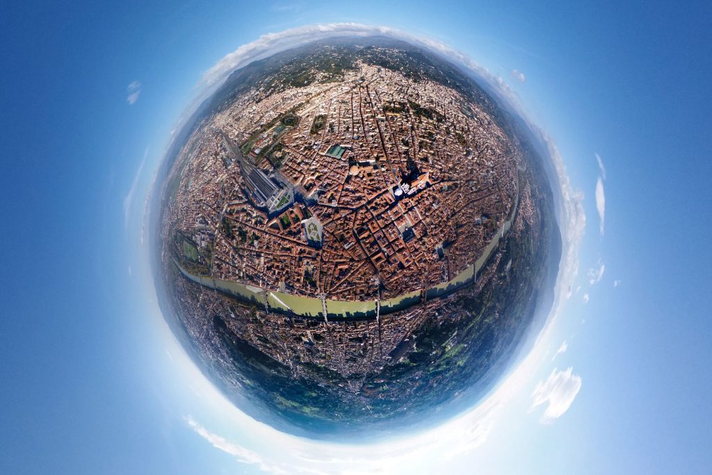 The second is a symbolic image of Florence which – seen from above – becomes a planet: this was achieved by projecting, from a helicopter, an omni-directional 360°-camera for a spherical view tied to an eight meter-long pole.