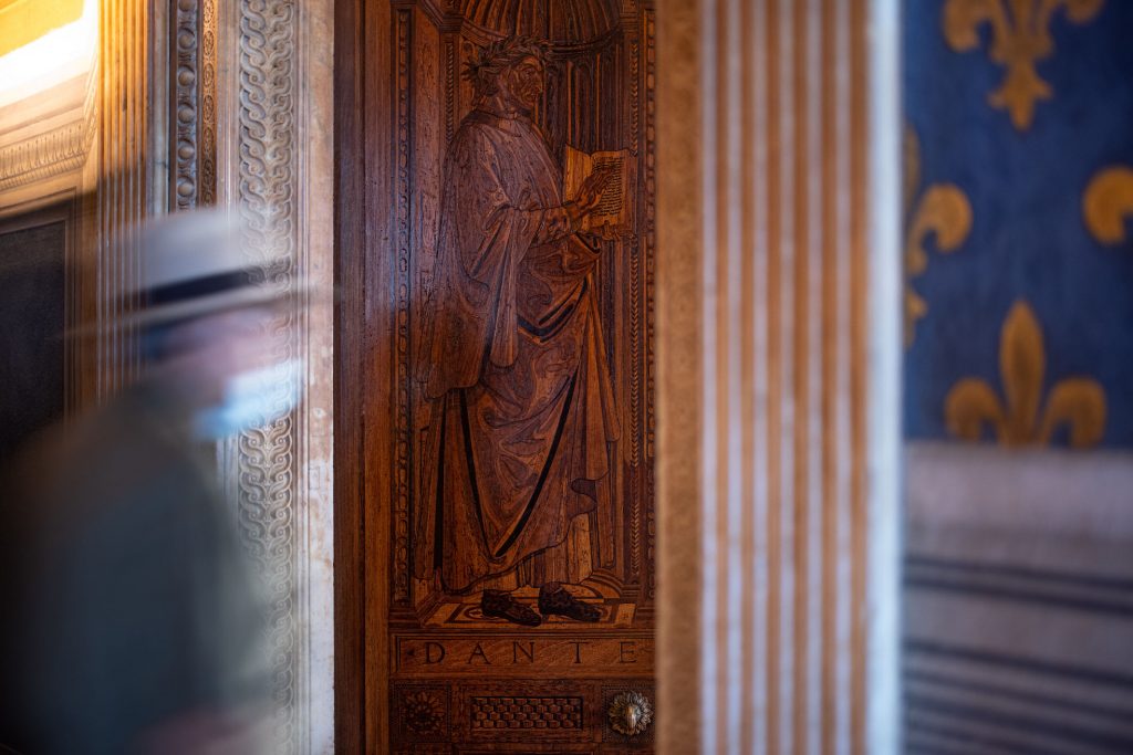 Accompanying the 23 shots is a Renaissance masterpiece: a wooden door from the Palazzo Vecchio Museum, made in 1480 by Giuliano da Maiano and Francesco di Giovanni (known as Francione), based on a drawing by Sandro Botticelli. The full figure of Dante is portrayed in wooden inlay. It is a precious work, both for its intrinsic value and the image of the poet handed down to us by him.