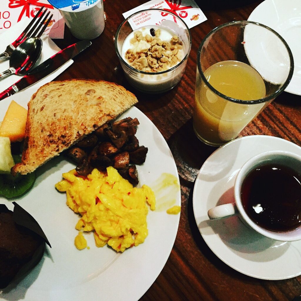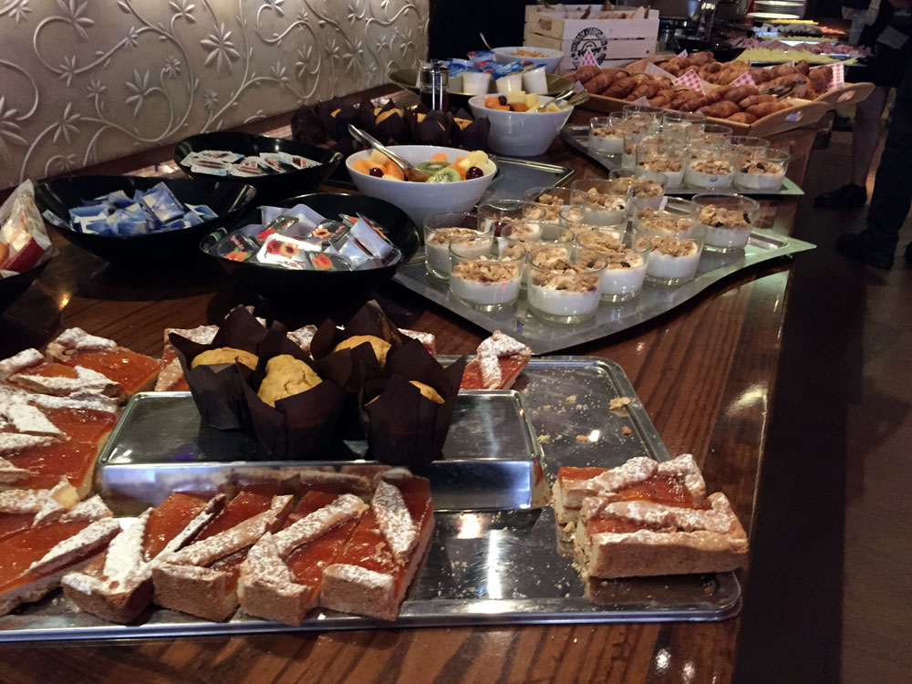 In the meantime, we set out to check out the buffet brunch which included many sweet options as well as savory: apricot crostata, muffins, yogurt with granola, fresh fruit salad, yogurt, croissants (various types, the chocolate ones were delicious!), toast with many jams and Nutella at hand. For the savory part, there hard boiled eggs (can’t forget them for an Easter brunch, right?), soft scrambled eggs, prosciutto ham, cooked ham, sliced cheeses, bacon, sauteed mushrooms. I have to say I have gone to other brunches that included a few more things that were missing on this last one and that I hope they will bring back: pancakes, waffles and hashbrowns! For me, these are part of American style brunch!