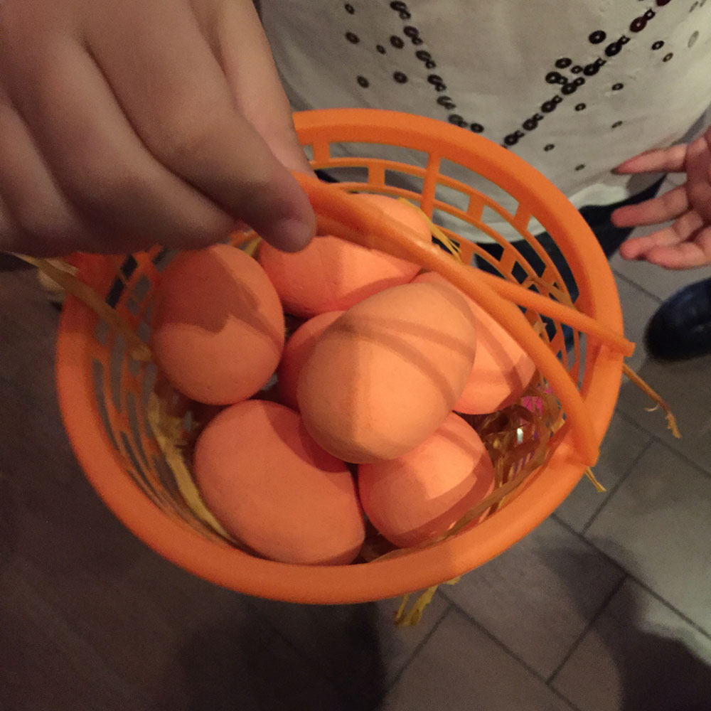 Time for Easter Egg hunt! I went to check out what the kids were doing – a few group games, but soon the Easter egg hunt was started. The team had Styrofoam eggs in various colors and divided the kids up into teams, each one had a different color. So it wasn’t enough to find eggs, they had to find their color and fill up their basket. I thought it was pure genius in ensuring that the bigger faster kids did not take all the eggs away from smaller kids.