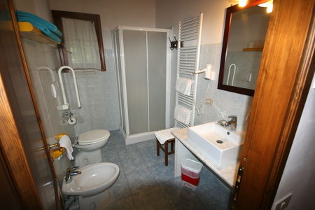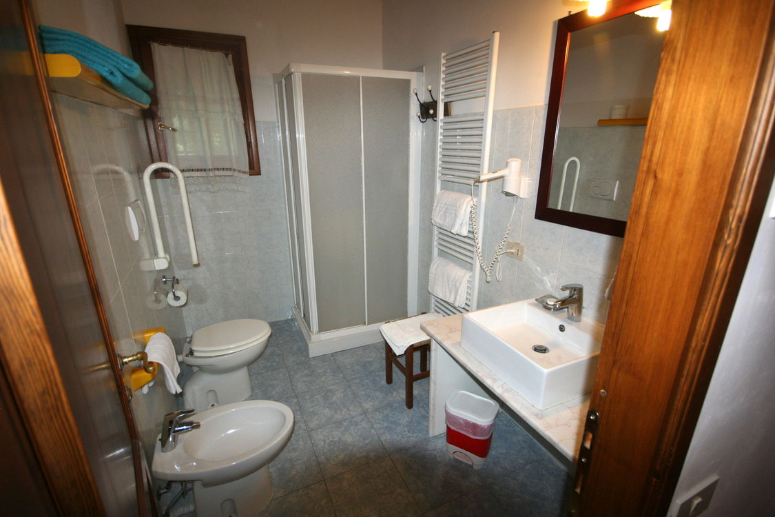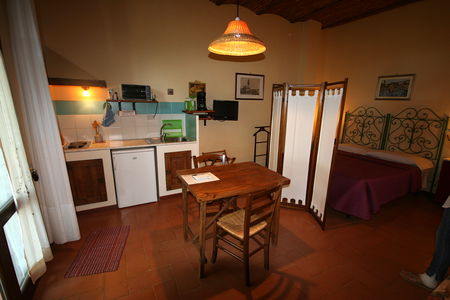 The ground floor is comprised of two apartments, which can be combined to create a two bedroom, two bathroom accommodation for up to 6 persons. Separately, you have Ginestra, a cozy studio apartment, with a kitchenette, a designated living/dining room area with a separè and a double bed and bathroom. Next door is the apartment Erica, a one bedroom/bathroom apartment. The private patio areas for each, located directly in front of the apartments, are in a shady corner, protected by pines, cedars and oak trees.