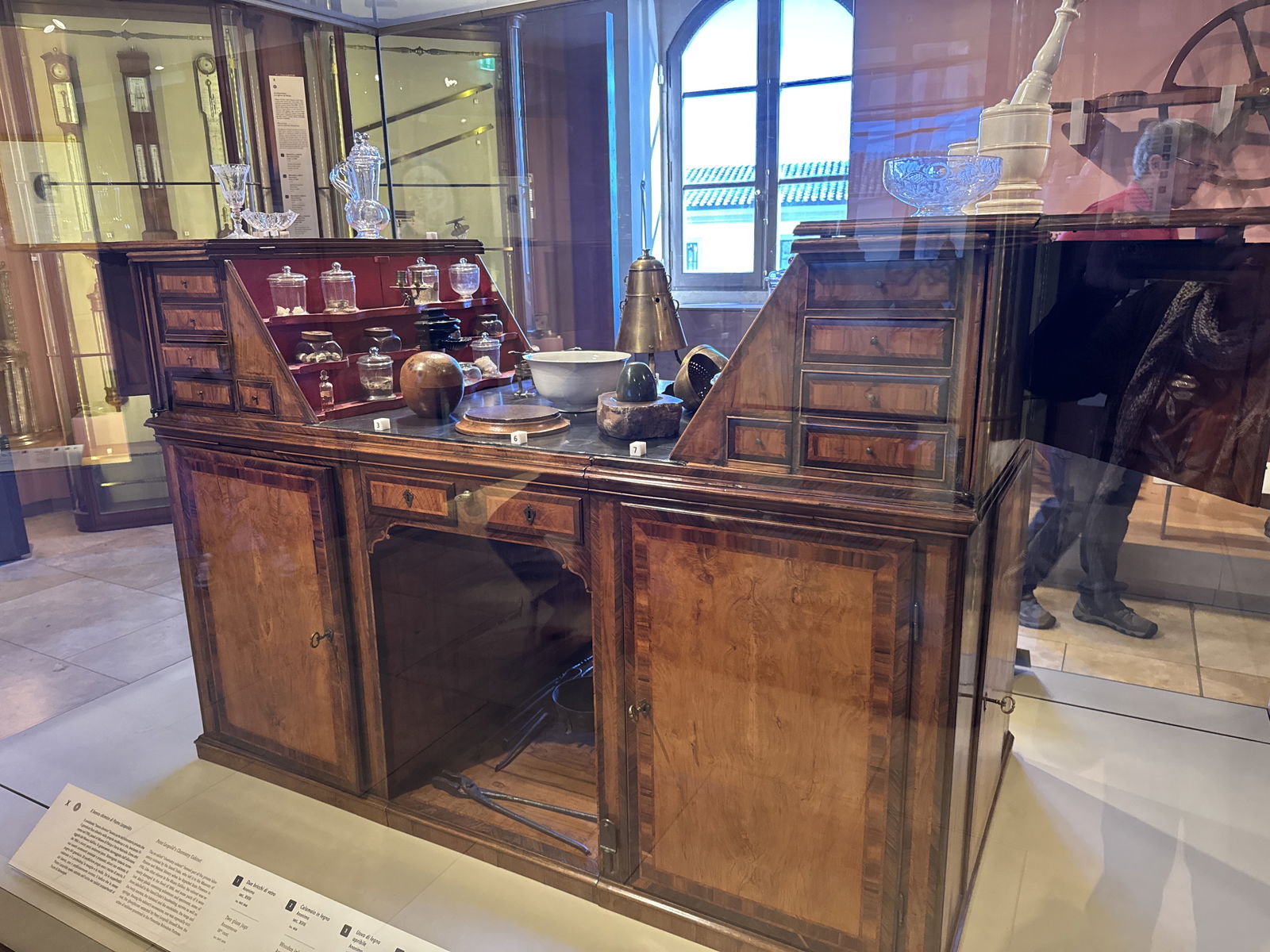 The following rooms are rich in many types of instruments, from a clockwork mechanism operating a mechanical writing hand, a plate with brass tubes that could create electric shocks and barometers, vacuums and some of the first electric motors.