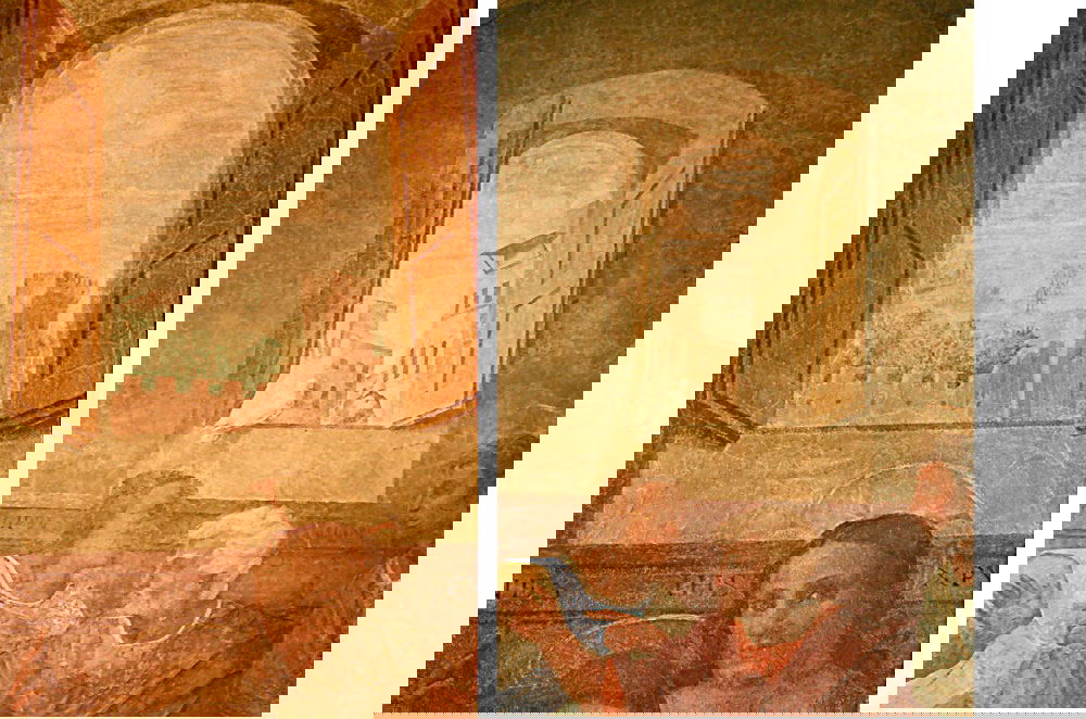 Mother Superior Antonia de’ Medici entrusted Francesco di Cristofano, called Franciabigio (1482-1525) to portray thespecific scene, during the Last Supper, immediately after the words by Jesus: “Truly I tell you, one of you will betray me.” Franciabigio thus depicts a deep sadness in Jesus’ eyes, Judas’ sudden movement and the confused expressions of the Apostles around the table. One can notice each reaction and recognize each Apostle name painted along the strip which runs above their heads. The painter added here the date A(nno) S(alutis) MDXIIII (A.D. 1514) and his signature through a twisted shortened monogram (FRAC). If you observe the painted floor you can even distinguish the name of the Mother Superior Antonia (SVORA AN), marked on the low left side under the table, between the second and third Apostle.