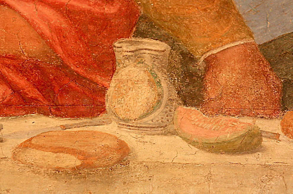 Let your eye freely explore each magnificient detail, painted along the fine linen tablecloth: you will find ceramic jugs, rolls, glasses with red wine, sliced water melon. Several jugs feature the typical Medici coat-of-arms (the one with the red spheres) referring to Mother Superior Antonia and the Red Cross of the Order of Knights of Malta whom the nuns (Dames) originally belonged.