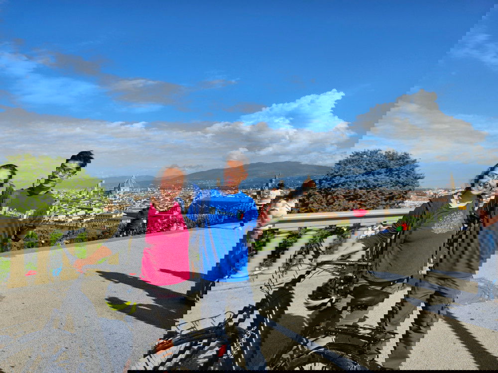 The bikes are good quality hybrid e-bikes, allowing for an upright and comfortable riding position and proving to be perfect for the route ahead. The first stretch on the bike path along the Arno is a good opportunity to get used to the electric assist, which is very helpful and gives a strong boost while pedaling. If you’re used to biking, keeping the assist on the lowest setting is usually enough – otherwise the push might be a bit too much, especially on flat terrain. There’s a bit of a learning curve with gear selection on hills, and when needed, the “+” on the electric motor gives extra help. The climb up to Piazzale Michelangelo provides time for everyone to practice.