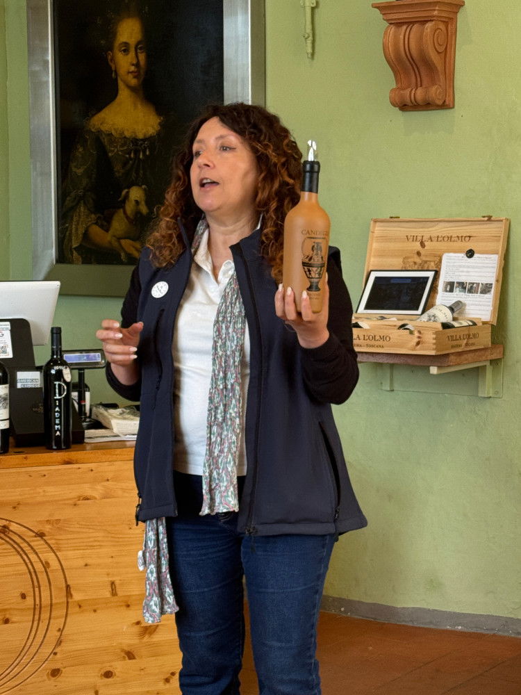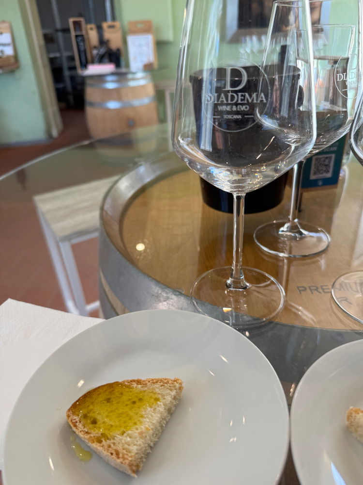 Next, we head to the tasting room where we sample olive oil made from the trees surrounding the villa, pressed in the mill we just toured. We taste two types: one with a bold flavor we preferred on bruschetta, and a milder one, perfect for dressing dishes. The sommelier, Stefania, explains the oil production process and the differences between types in a clear and engaging way. She then leads us through a tasting of three wines produced by the estate under the Diadema label: a rosé perfect for an aperitif, a red aged in amphora for meals, and a fine red to pair with bold-flavored dishes.