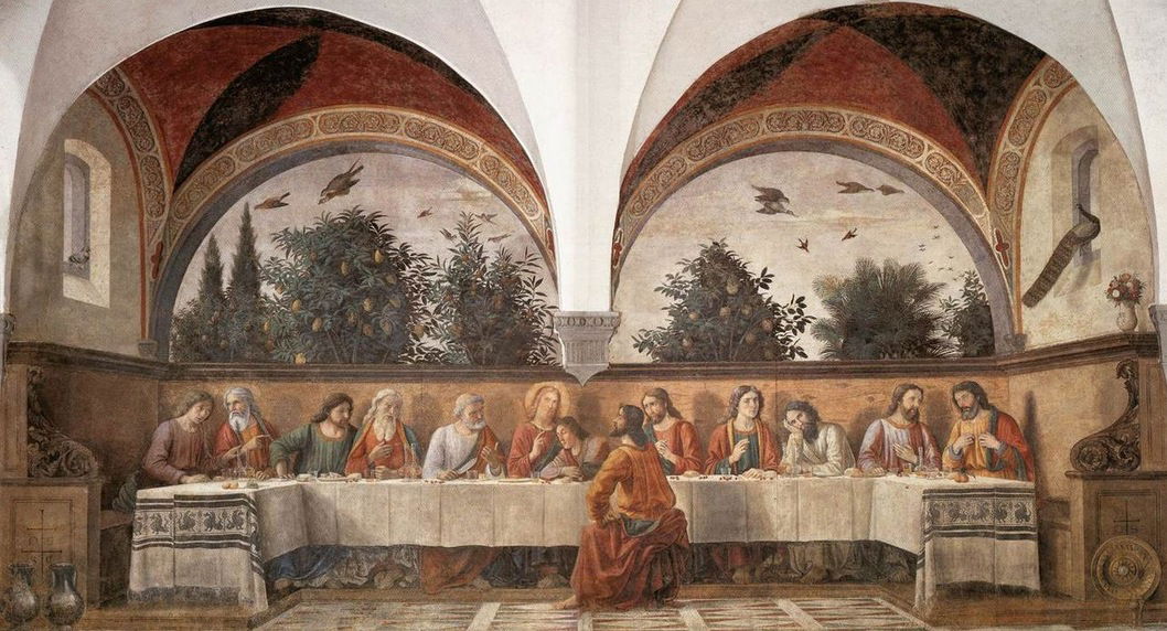 Ghirlandaio lavorò a varie commissioni e in particolare nel 1480 fu impegnato ad affrescare una parete del vasto refettorio, un’aula di ben trentadue metri, raffigurando l'Ultima Cena, datata ai piedi di Cristo.