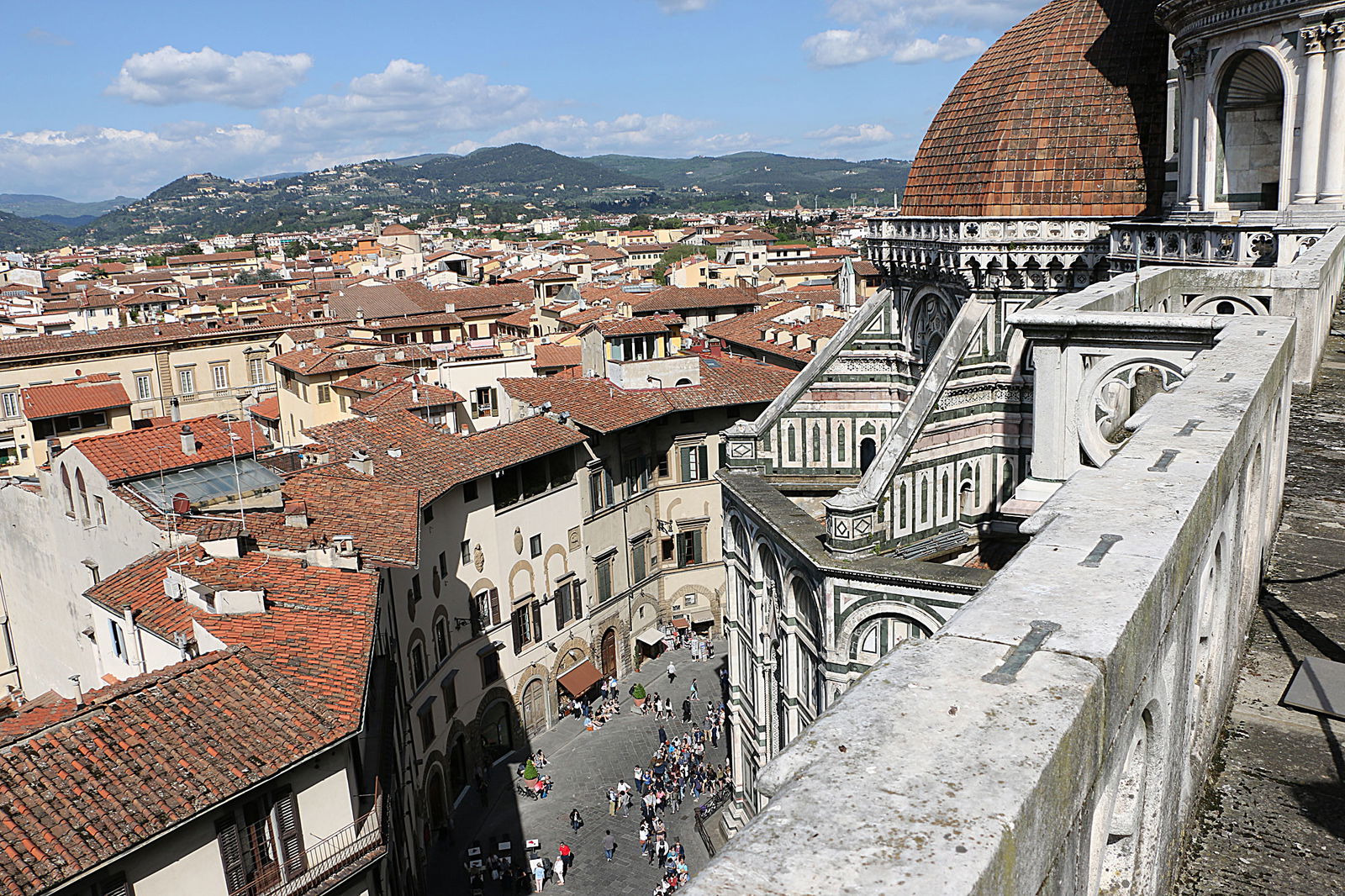 Le terrazze si trovano alla giusta distanza soprattutto per coloro che sono titubanti all'idea di dover affrontare 463 gradini per arrivare fino in cima alla cupola del Duomo (per salire fin sopra il Campanile, ce ne sono 414). Non solo abbiamo potuto ammirare una visuale estremamente panoramica di Firenze, Fiesole e delle montagne retrostanti, ma anche una nuova ed intrigante prospettiva dell'esterno della cattedrale, della cupola vista da vicino e del Battistero antistante.
